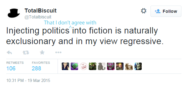 I know Total Biscuit enjoys Star Trek tv series which are often built entirely of political themes, so kind of weird stance to take, especially the third one.